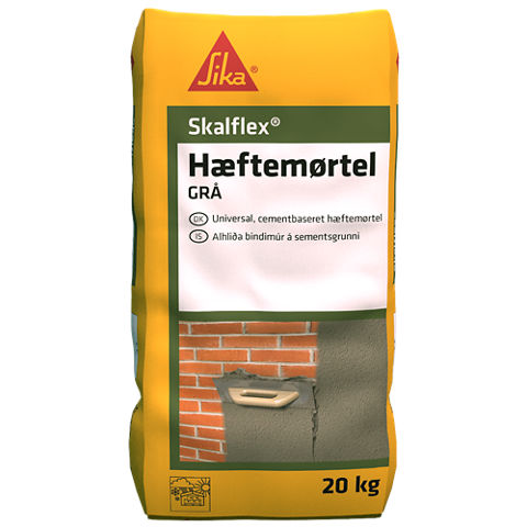 Skalflex Hæftemørtel er en alsidig cementbaseret hæftemørtel/tyndpuds til indendørs og udendørs brug, der kun skal tilsættes vand. Skalflex Hæftemørtel leveres i to farver: Grå og Råhvid, og kan stå som færdig overflade eller males med Skalcem 100, Skalflex Facade-Silikatmaling eller Skalflex Siloxanemaling.