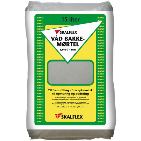 Skalflex Bakkemørtel Våd 6,6% er en fabriksfremstillet og 6,6% kalktilpasset bakkemørtel med kornstørrelse 0-4 mm.