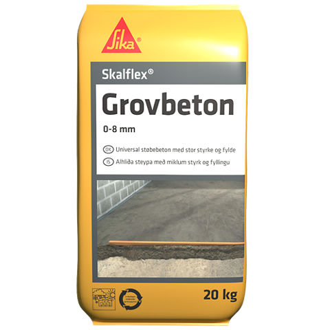 Skalflex Grovbeton 0-8 mm er en grovkornet tørbeton, der på byggepladsen kun skal tilsættes vand. Produktet har god bearbejdnings- og vedhæftningsevne.