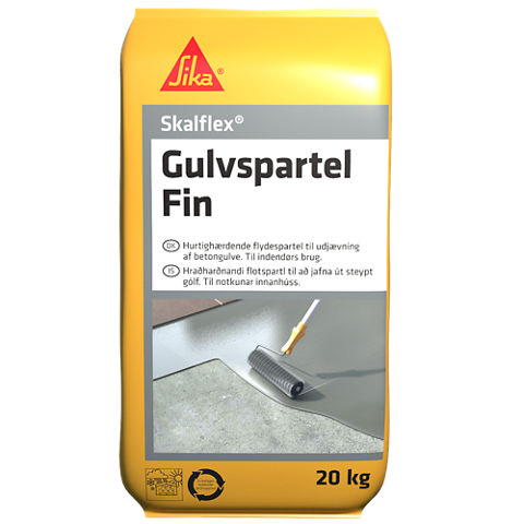 Hurtighærdende, letflydende, cementbaseret gulvspartel, der kun skal tilsættes vand. Produktet er selvudflydende, volumenstabilt og pumpbart. Skalflex Gulvspartel Fin kan ikke stå som færdig gulvoverflade, og skal efter afbinding beklædes med slidstærk gulvbelægning som f.eks. tæpper, vinyl, linoleum, træ, klinker m.m.