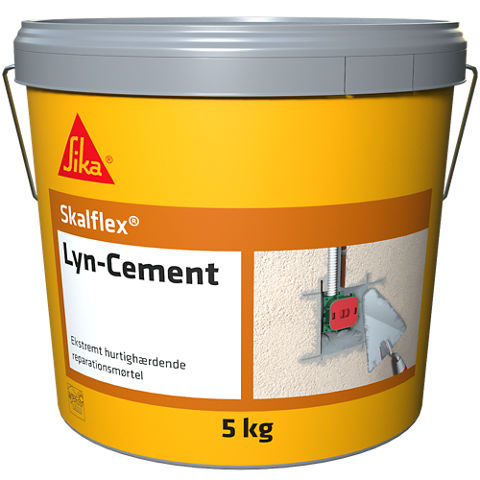 Skalflex Lyn-Cement er en ekstremt hurtighærdende reparationsmørtel til f.eks. fikseringsopgaver, hvor der ønskes hurtig styrke samt til små reparationsopgaver, hvor der skal efterbehandles umiddelbart efter. Produktet påbegynder afbinding efter ca. 3 minutter, og kan efterbehandles efter blot 30 minutter.
