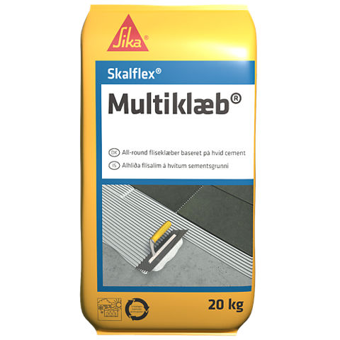 Skalflex Multiklæb er en fleksibel, vandfast og frostsikker all-round fliseklæber, baseret på hvid cement. Lang bearbejdningstid, let og smidig forarbejdning, optimal vedhæftning og skal kun tilsættes vand.