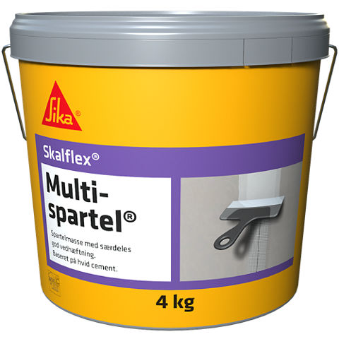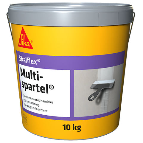Skalflex Multispartel® er en hvid, cementbaseret spartelmasse med særdeles god vedhæftningsevne og stor rækkeevne. Baseret på hvid cement. Let at påføre i små og store lagtykkelser. Skalflex Multispartel® er fugthærdende, diffusionsåben og vandfast, og kan forstærkes med Skalflex® Armeringsnet.