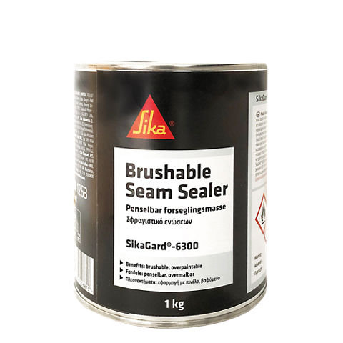 Forsegling af sammensvejsninger – påføres med pensel.SikaGard-6300 er en forseglingsmasse til påføring med pensel, der gør det muligt for bilværksteder at genskabe de originale penselstrøg. Anvendes hovedsageligt på sammensvejsninger, støddæmperophæng, bund- og skilleplader etc. Tørrer hurtigt, efterlader synlige penselstrøg og har god vedhæftning på forskellige metaller. Der skal foretages afprøvning på det aktuelle materiale inden brug. Dette produkt bør kun anvendes af professionelle, erfarne brugere.